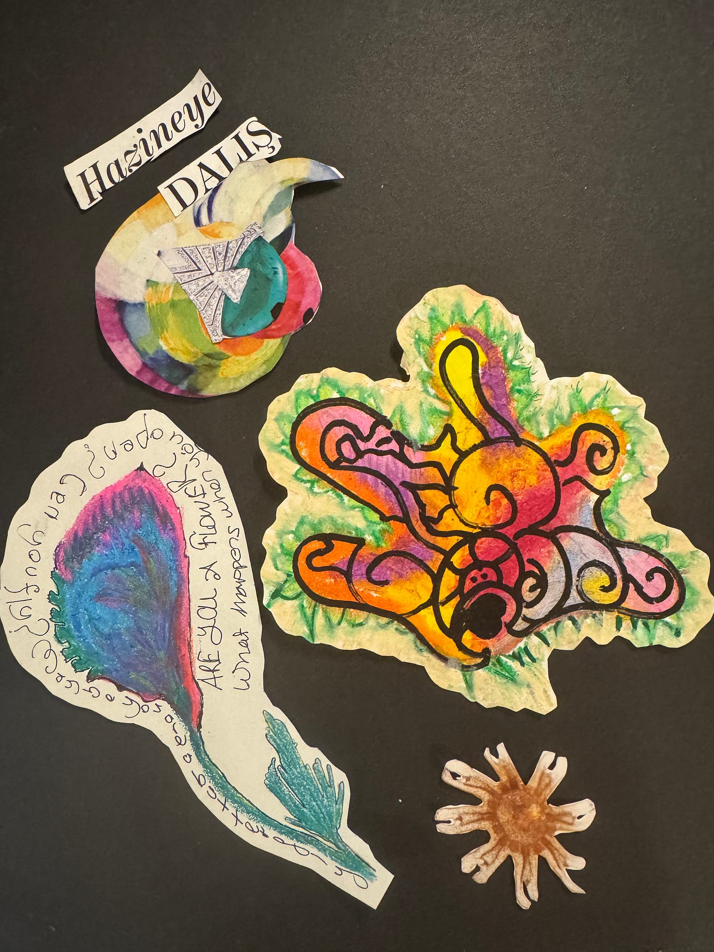 Gökyüzünde uçuşan bir çiçek, denizin derinliğinde açan bir kelebek, ormanın derinliğinde bir balık! Yeni yaptığım içsel şekil sayesinde bu ütopik hayalleri kuran deli dolu içsel kalbi görüyorum. Hani o siyahlara boyadığım kalp merkezimden geliyor tüm bu hayaller. Ve sonra yaratıcı birşeylere dönüşmesine izin verirsem ancak ifade buluyor canlanıp titreşiyor. Ve bir farkındalık, artık belki de daha açık daha cesaretliyim eskiye göre. O zamanlar çiçeğe sorduğum sorunun ‘Eğer açarsan/açılırsan ne olur?’ un yanıtını bugün Poetika Journal sayesinde kendi içsel şeklimi çizdiğimde cevaplamışta oluyorum. Yaşla deneyimle ne çok şey değişmiş içsel halimde.