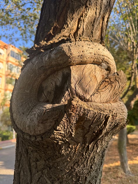 İçerisi renk renk çoğunlukla sıcak tonlar olsa da daha soğuk olan mavileri morları da görüyorum. Üzerlerine desenler geliyor çoğunlukla bir spiral başlangıcı gibi kıvrımlar.. Bu benim için çok bildik bir şekil. Evvel ezel bir şeyler çizsem dediğimde ortaya çıkan, tuttuğum notlarımın etrafına karaladığım çizgilerimin arasından çıkan spiral. Resim yapmaya başlamadan önce sabah çıktığım yürüyüşte beni durduran işte bu kıvrımlar; ağaçların gövdelerinde, kedilerin kendilerini uykuda kucaklayan yatışlarında tam olmasada spiral gibi yumuşak kıvrımlı halleri dikkatimi çekmiş fotoğraflamıştım.