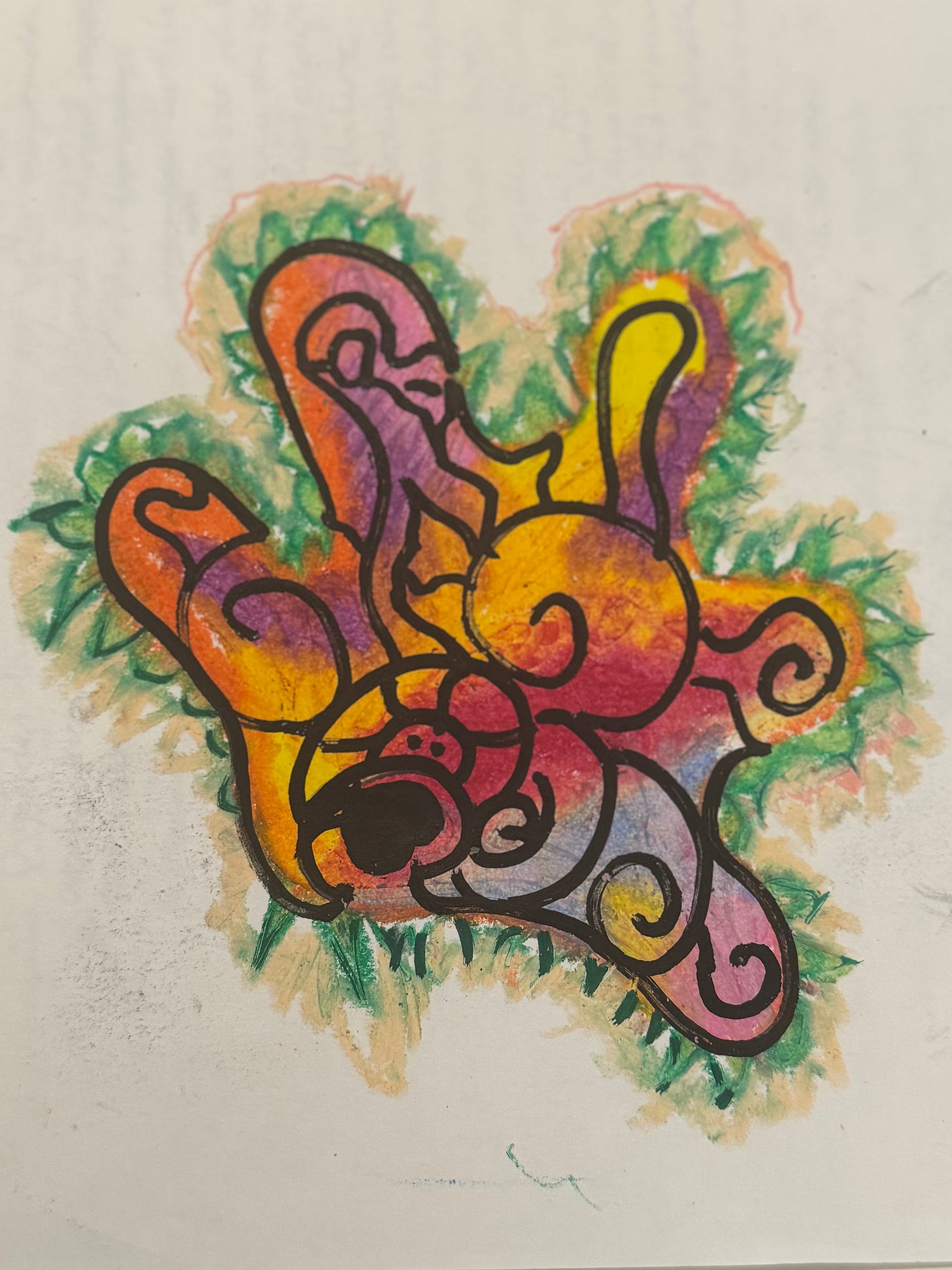 Bir de beni şaşırtan bir şey, yıllardır kendimi içe dönük bir insan olarak tanımlarken bu el şeklinin bu kadar açık ve dışarıya uzanıyor hissi vermesi ilginç geldi. Çiçek gibi açılmış bu sayede tamamen içime bakıyormuşum hissi, sonrasında kapansa neye benzer? diye merak ettirdi. O merakın peşinden gitmek, daha eskilerde yaptığım bir karalama çizime götürdü beni.