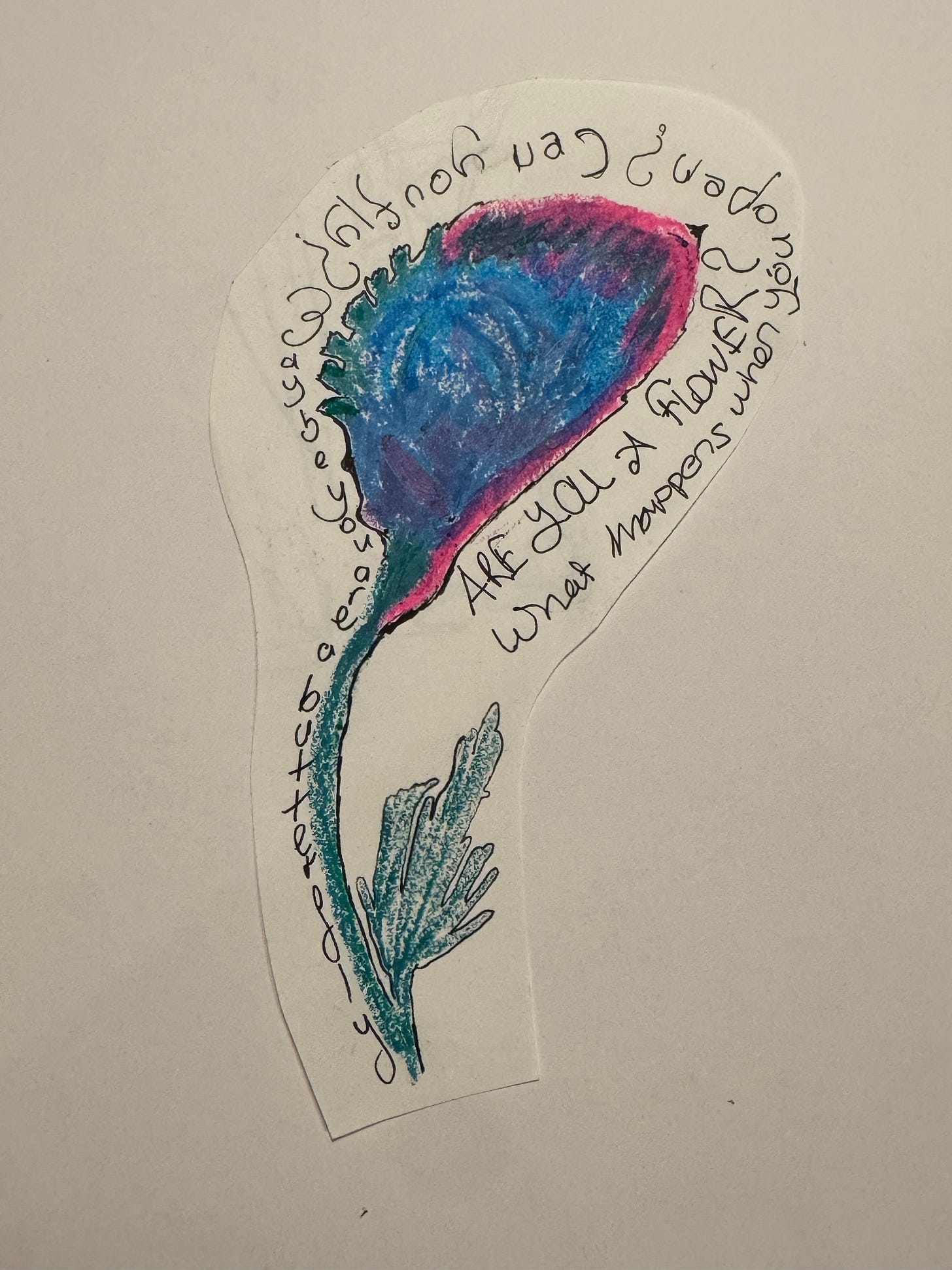 Sanırım bir çiçek belki bir kuş ya da balık. Dış renkler soğuk. Yapraksı dikenler yine etrafını çevrelemiş ama bana kapalı hissi veriyor bu şekil daha güvenli hissettiriyor aslında diğerinden. İçindense canlı pembe bir kuş ya da balık çıkacak gibi. Etrafına sorular yazmışım ve şuan hiç bilmediğim bir sebeple ingilizce: